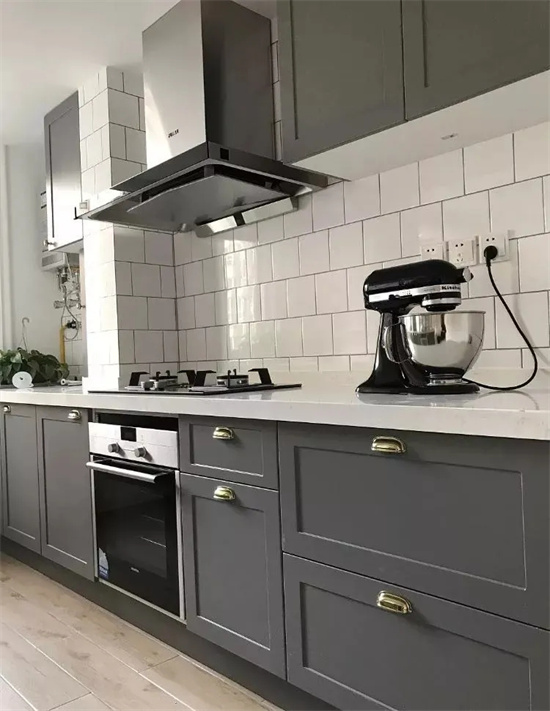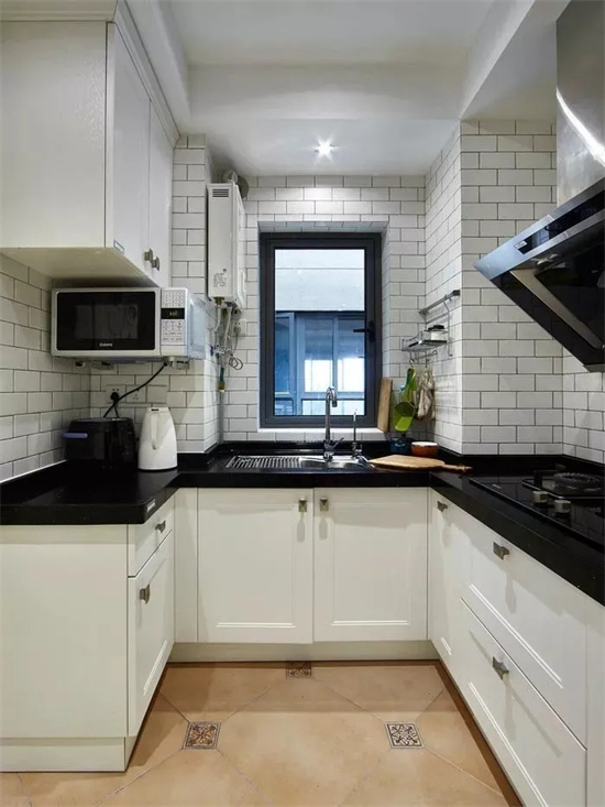 有些厨房规格偏长,长方形设计的厨房可以设计成“L”型,这样设计空间利用率更高,方便加装橱柜,增加储物空间。也方便动线设计,让整个厨房操作流程更顺手。